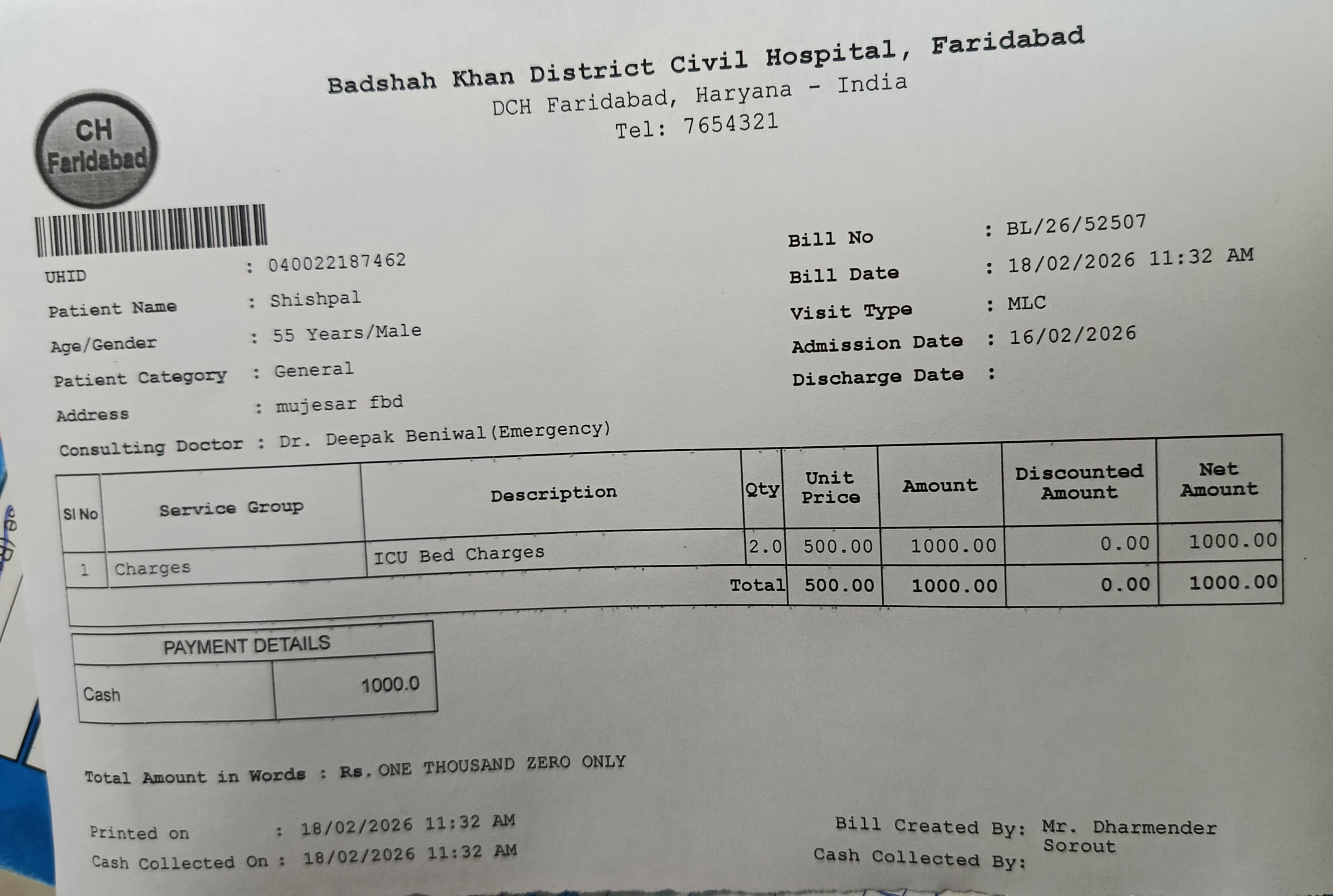 अनिल बेताब, फरीदाबाद। डिस्ट्रिक्ट हेल्थ डिपार्टमेंट का दावा है कि सिविल हॉस्पिटल और दूसरे हेल्थ सेंटर्स पर हेल्थकेयर सर्विस पूरी तरह फ्री दी जाती हैं। हैरानी की बात है कि जब भी कोई एक्सीडेंट होता है, तो सिविल हॉस्पिटल में जलने वाले लोगों को भी फ्री इलाज नहीं मिलता। उन्हें बाहर से दवाइयां खरीदने के लिए मजबूर किया जाता है। उनसे बेड चार्ज भी लिए जाते हैं।
