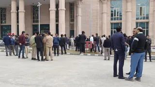 नई कोर्ट की बिल्डिंग के परिसर पर बम की सूचना मिलने के बाद मौजूद अधिवक्ता. Jagran