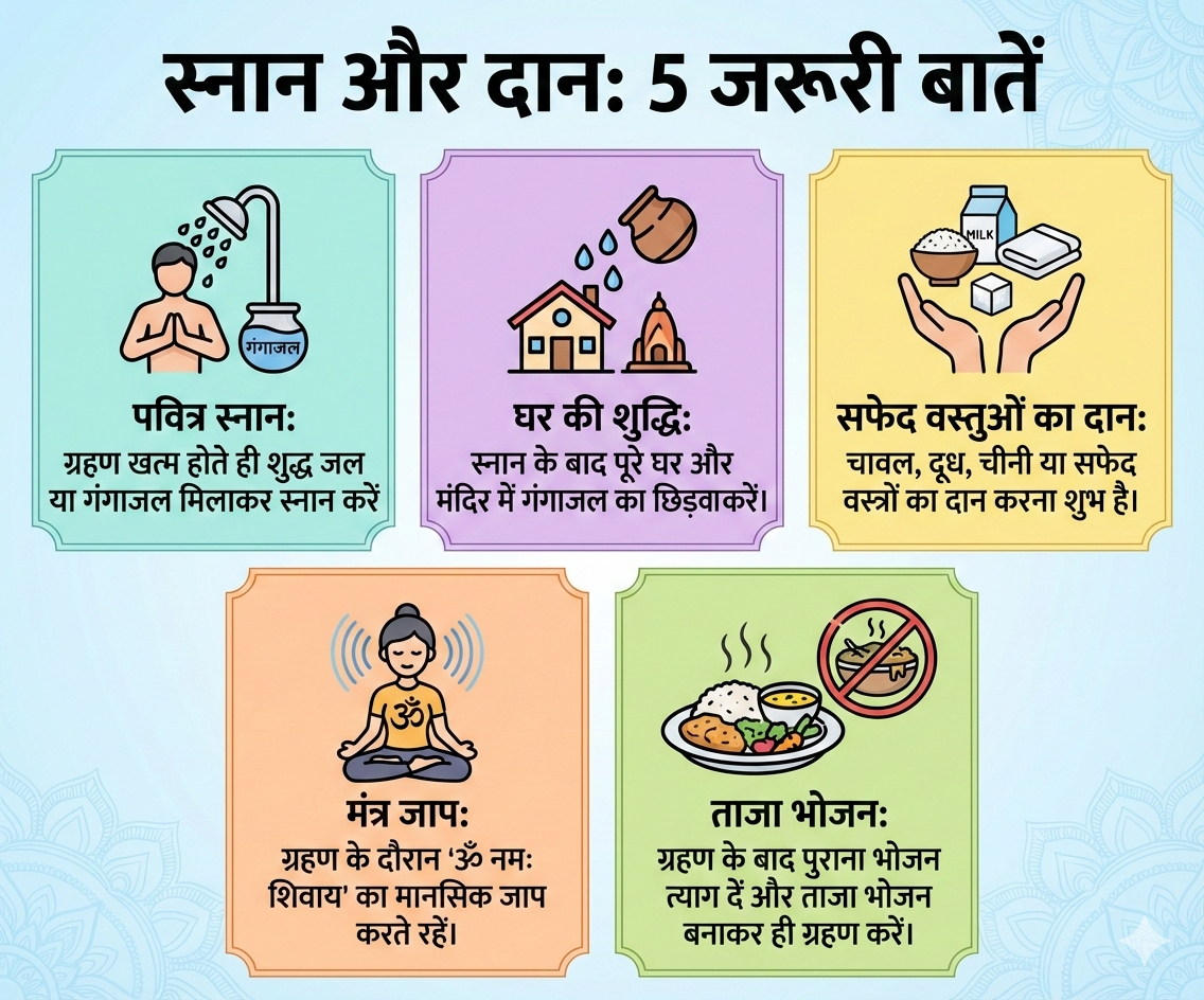 ग्रहण के दौरान और उसके बाद दान-पुण्य करने का फल अक्षय माना जाता है। शास्त्रों के अनुसार, ग्रहण खत्म होने के बाद किसी पवित्र नदी या घर पर ही गंगाजल मिलाकर स्नान करना चाहिए।