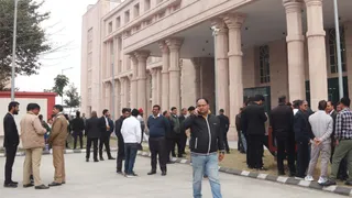 नए कोर्ट परिसर में बम की सूचना के बाद कोर्ट परिसर में जमा अधिवक्ता।