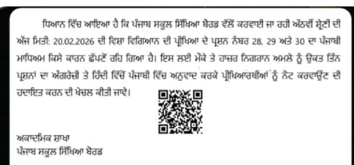 पंजाब स्कूल शिक्षा बोर्ड की बड़ी चूक; आठवीं विज्ञान प्रश्नपत्र में पंजाबी अनुवाद गायब, छात्रों को हुई परेशानी
