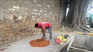 प्रयागराज के ऐतिहासिक खुसरो बाग की दीवार में चूहों के बिल को भरते पुरातत्व विभाग के श्रमिक। सौजन्य : पुरातत्व विभाग
