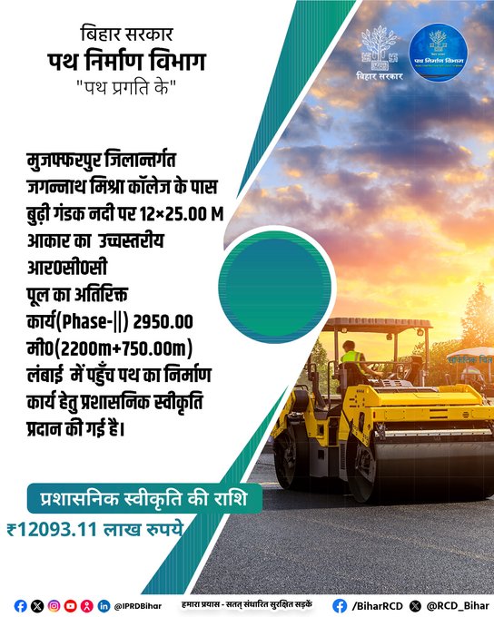 पूल का अतिरिक्त कार्य(Phase-||) 2950.00 मी०(2200m+750.00m) लंबाई में पहुँच पथ का निर्माण कार्य हेतु प्रशासनिक स्वीकृति प्रदान की गई है।@RCD_Bihar… pic.twitter.com/z6rJVwbSdI— RoadConst Dept Bihar (@RCD_Bihar) February 20, 2026 |