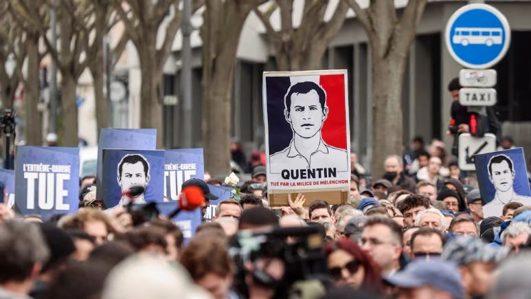 राष्ट्रपति इमैनुएल मैक्रों ने 23 साल के क्वेंटिन डेरांके को श्रद्धांजलि देने से पहले लोगों से शांति की अपील की। डेरांके की पिछले हफ्ते एक हॉस्पिटल में ब्रेन इंजरी से मौत हो गई थी।
