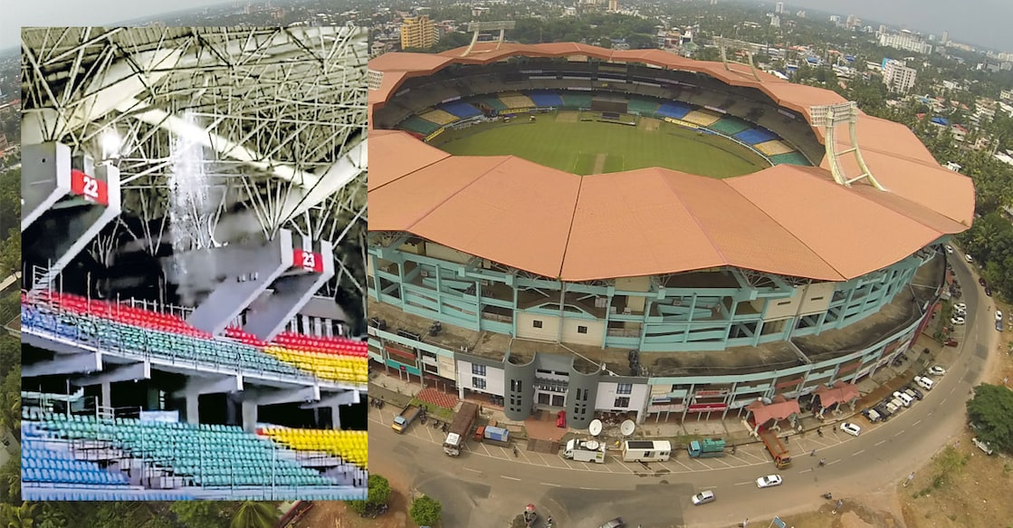 കലൂർ സ്റ്റേഡിയത്തില്‍ ‘സൗജന്യ ഷവർ ബാത്ത് ’; നവീകരിച്ച സ്റ്റേഡിയത്തിന്റെ മേൽക്കൂരയിലെ പാത്തി തകർന്നു