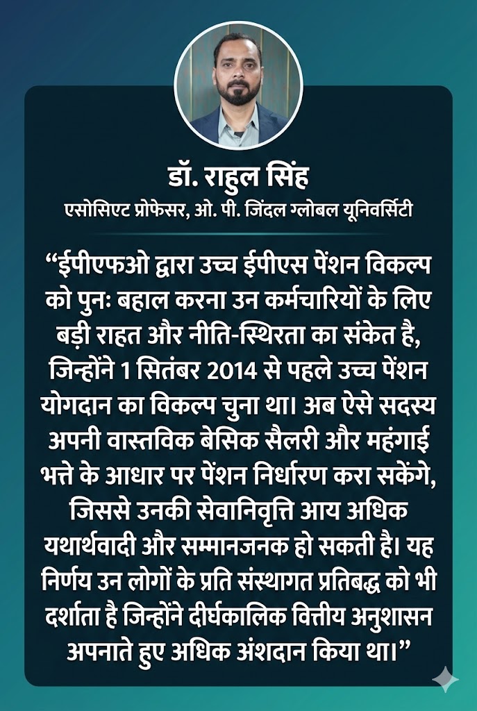 ओ. पी. जिंदल ग्लोबल यूनिवर्सिटी के एसोसिएट प्रोफेसर डॉ. राहुल सिंह ने कहा, “यह सुविधा सार्वभौमिक नहीं है। जिन कर्मचारियों ने पूर्व में उच्च योगदान का विकल्प नहीं चुना था या जिनकी पेंशन ₹15,000 की वेतन सीमा पर आधारित रही है, उन्हें इससे लाभ नहीं मिलेगा। ऐसे में यह कदम पात्र सदस्यों के लिए सकारात्मक है, लेकिन भविष्य में अधिक समावेशी और स्पष्ट पेंशन सुधारों की दिशा में निरंतर पहल आवश्यक रहेगी।“