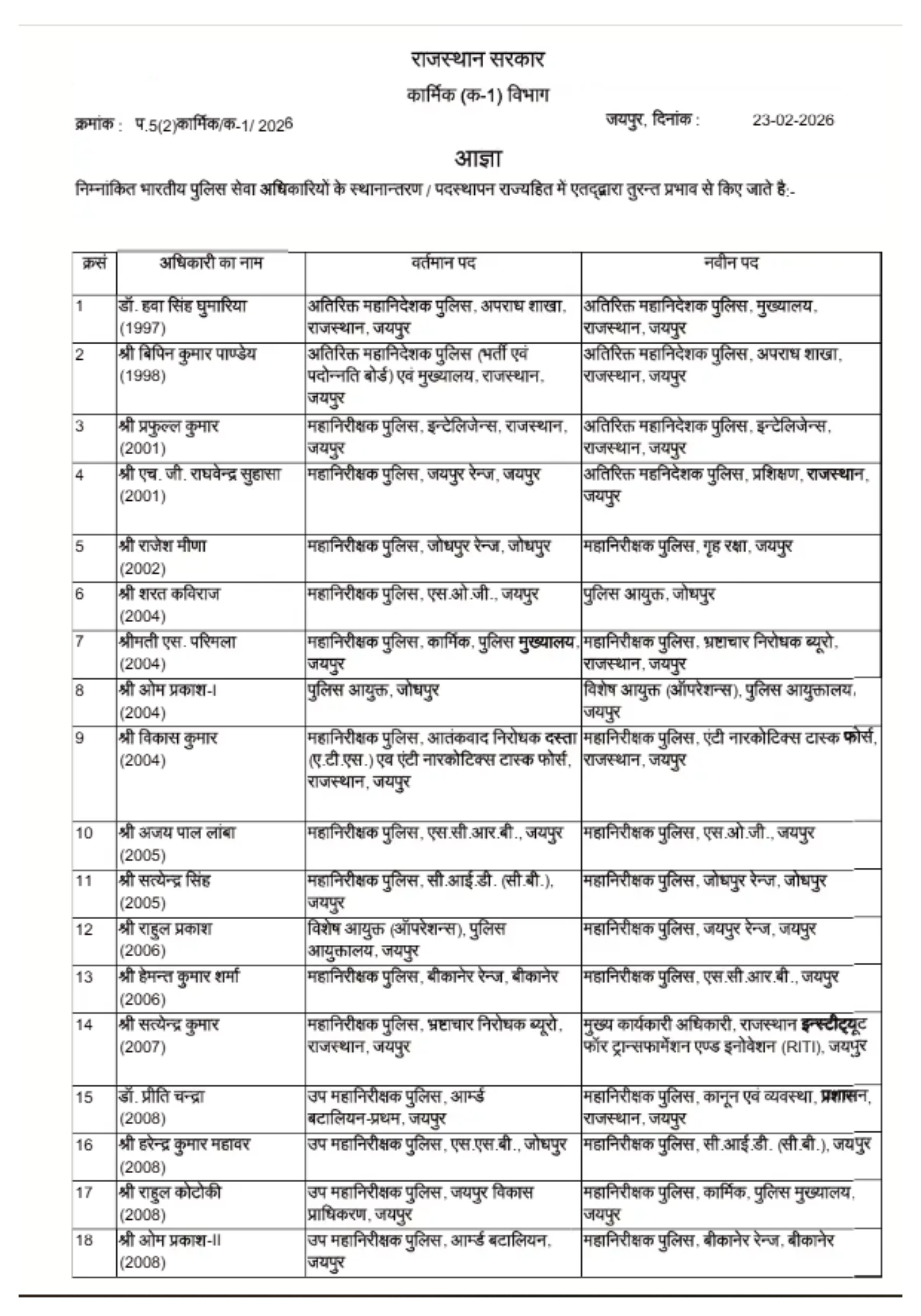 • जोधपुर में पुलिस कमिश्नर के पद पर ओमप्रकाश थे, जिन्हें अब जयपुर का स्पेशल पुलिस कमिश्नर बनाया गया है।