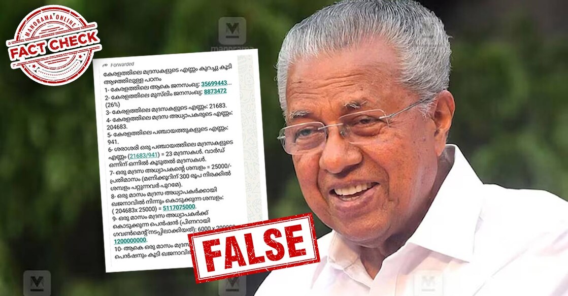 മദ്രസ അധ്യാപകരുടെ ശമ്പളത്തിനും പെൻഷനും സംസ്ഥാന സര്‍ക്കാരാണ് പണം ചെലവഴിക്കുന്നതെന്ന അവകാശവാദത്തോടെയുള്ള പോസ്റ്റുകൾ സമൂഹമാധ്യമങ്ങളിൽ വ്യാപകമായി പ്രചരിക്കുന്നുണ്ട്. വൈറൽ പ്രചാരണത്തിന്റെ വസ്തുതയറിയാൻ മനോരമ ഓൺലൈൻ ഫാക്ട് ചെക്ക് നമ്പറിലും സന്ദേശം ലഭിച്ചു. എന്നാൽ ഈ പ്രചാരണം തെറ്റാണെന്ന് അന്വേഷണത്തിൽ വ്യക്തമായി. വസ്തുതയറിയാം