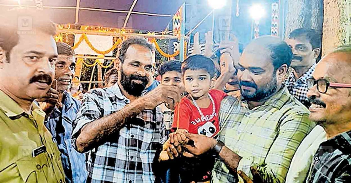 എന്നാൽ ബ്രേസ്ലറ്റിന്റെ കൊളുത്ത് അഴിഞ്ഞു. അതോടെ ബ്രേസ്ലറ്റ് സഹിതം ബലൂൺ പറന്നുയർന്നു. ബലൂൺ ശരവേഗത്തിൽ പറന്നു കാഴ്ചയിൽ നിന്നു മറഞ്ഞു. പിന്നീട് അഗ്നിരക്ഷാസേന പരിശോധിച്ചപ്പോൾ തൊട്ടടുത്തുള്ള വലിയ പാലമരത്തിന്റെ മുകളിൽ ഉടക്കി നിൽക്കുന്നതായി കണ്ടു. വലിയ വണ്ണമുള്ള പാല മരത്തിൽ കയറാനും പ്രയാസമാണ്. പുലർച്ചെ രണ്ടരയോടെ സന്തോഷ് കുമാർ സാഹസപ്പെട്ടു പാലമരത്തിൽ കയറി. തൊട്ടടുത്ത വലിയ തെങ്ങിലെ ഓല പാലമരത്തോടു ചേർന്നു നിന്ന ഭാഗത്താണു ബലൂൺ ഉടക്കി നിന്നത്. സന്തോഷ് കുമാർ മുകളിൽ എത്തിയപ്പോൾ ബലൂൺ ഉടക്ക് വിട്ടു വീണ്ടും ഉയർന്നു. പെട്ടെന്നു കയ്യിലെ വലിയ തോട്ടി ഉപയോഗിച്ചു ബലൂണിനെ തടഞ്ഞു. അതിലെ നൂൽ തോട്ടിയിൽ ഉടക്കി. പിന്നീട് മെല്ലെ ബലൂണും ബ്രേസ്ലറ്റും സന്തോഷ് കുമാർ കൈക്കലാക്കി. സന്തോഷ് കുമാർ തന്നെ ബ്രേസ്ലറ്റ് കുഞ്ഞിന്റെ കയ്യിൽ വച്ചു കൊടുത്തു. English Summary: