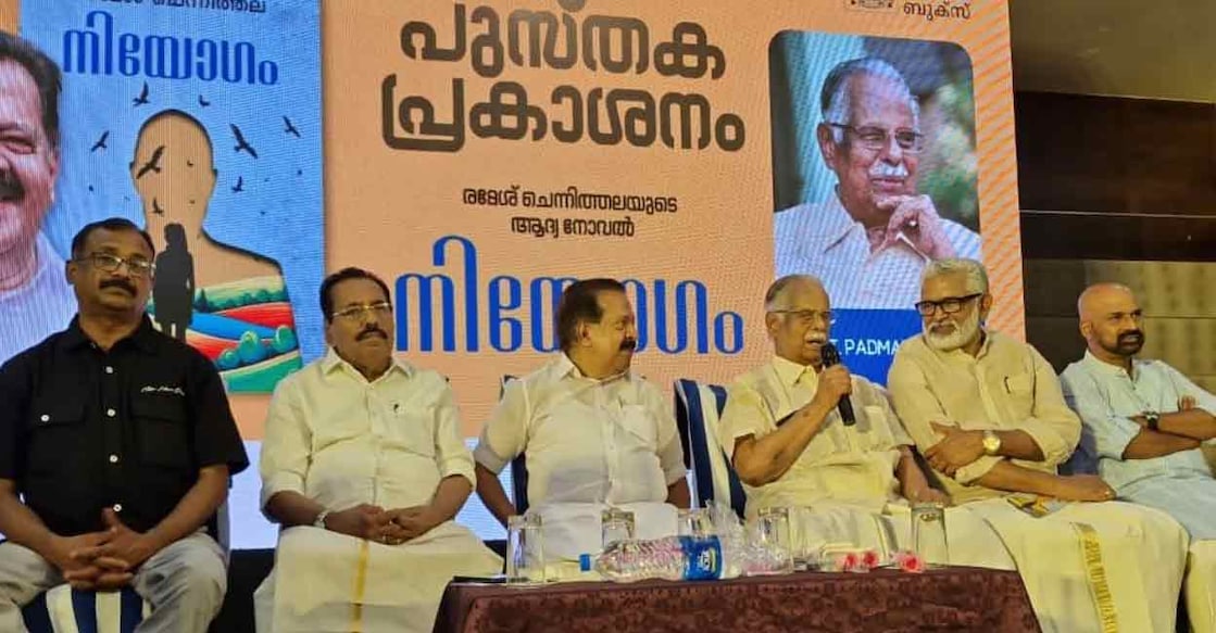Ramesh Chennithala\“s first novel \“Niyogam’: “T. Padmanabhan, the noted writer, wished that senior Congress leader Ramesh Chennithala would be blessed with all kinds of good fortune in the near future. He was speaking at the function to release \“Niyogam\“, the debut novel of Ramesh Chennithala.“